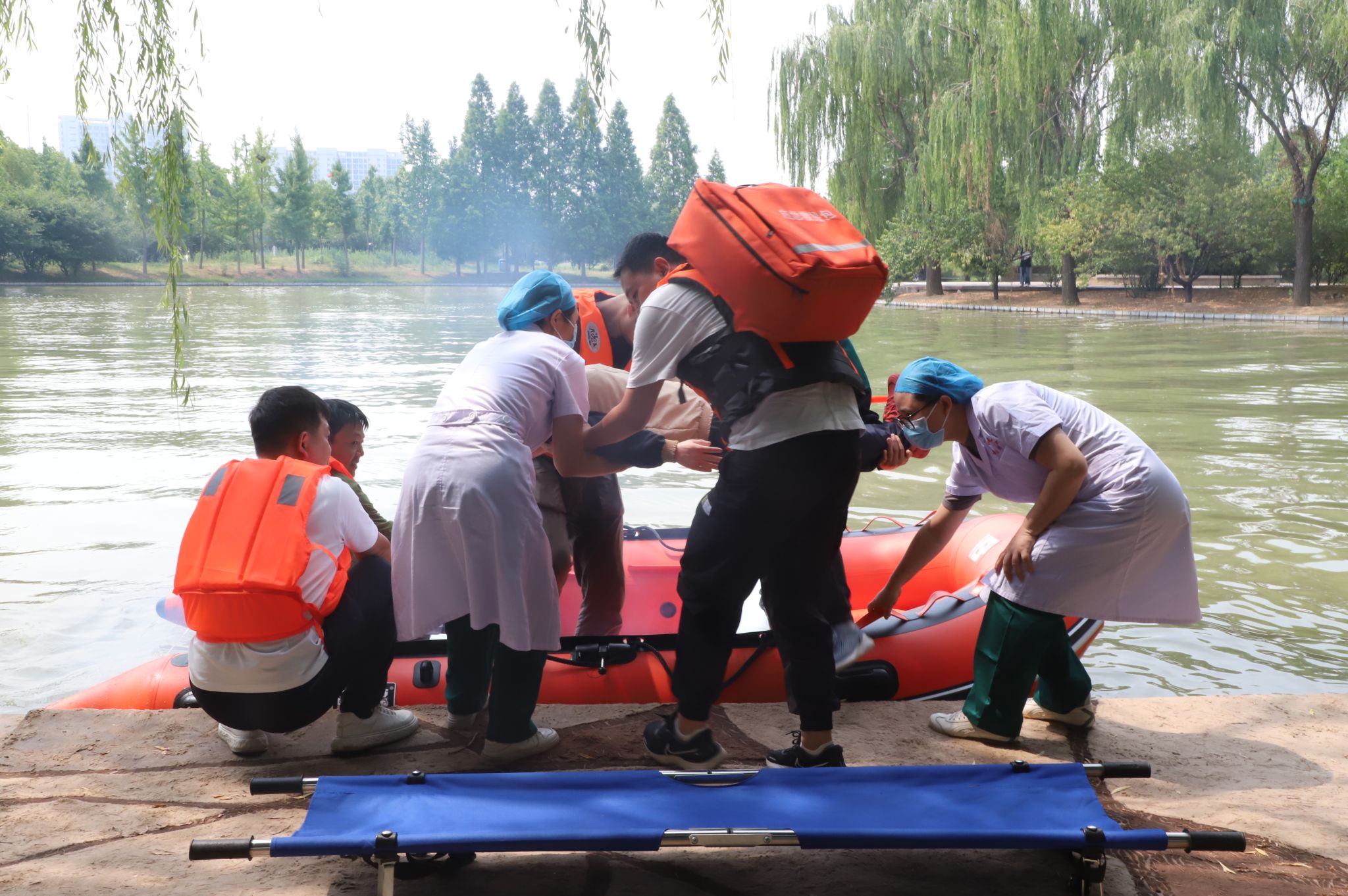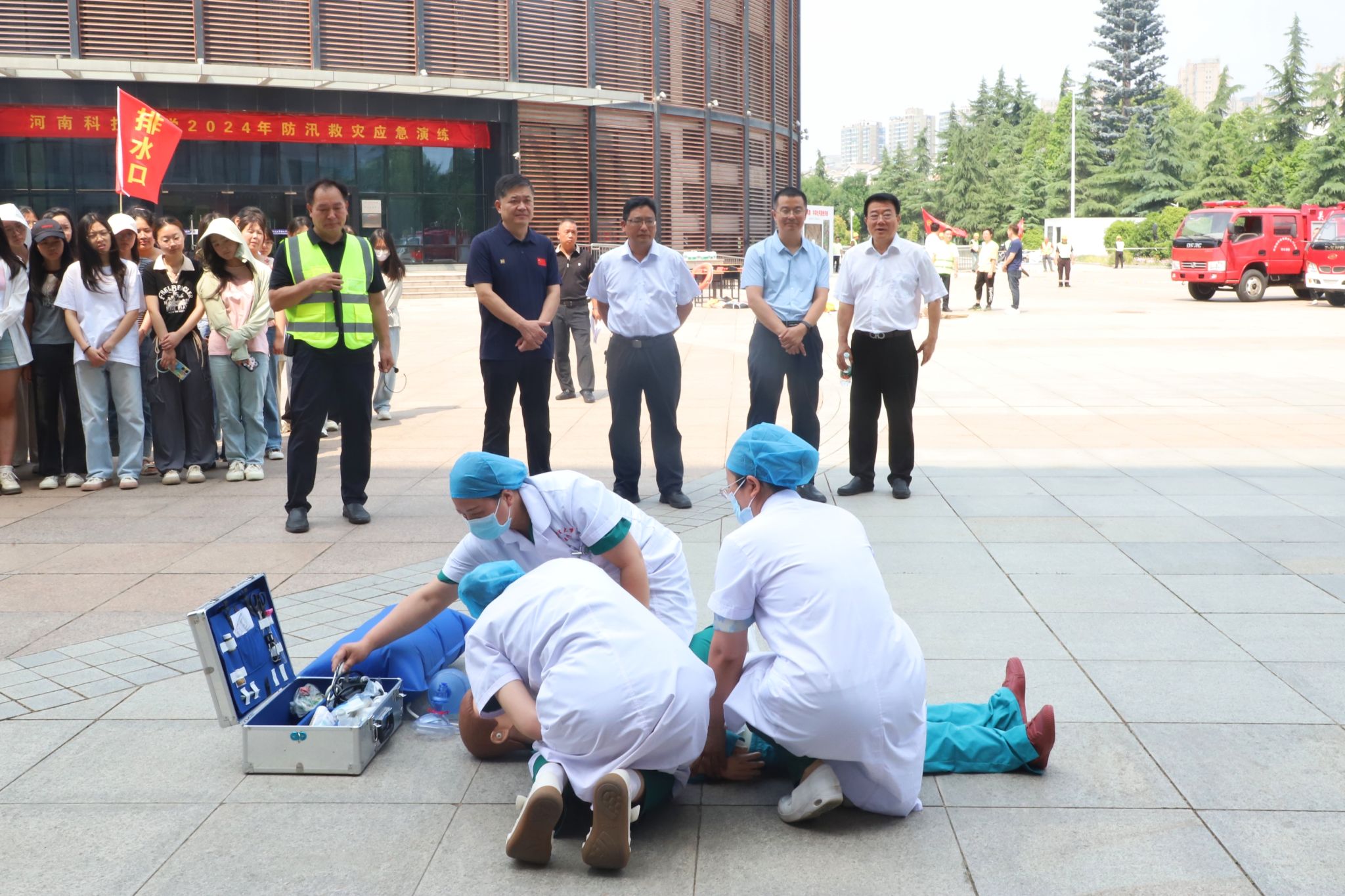上午10时,防汛救灾应急演练物资、人员全部就绪,演练开始。巡视值班人员发现学生宿舍人员被困、地下室及下沉广场积水严重、水系雨水大量漫出安全线等险情,立即向学校防汛指挥部报告,防汛领导小组立即启动防汛应急预案,进入防汛应急程序。应急抢险组、师生疏散组、医疗救援组、物资保障组等150余人火速集结,迅速进行抢险救援物资分发、紧急排水、排查电力、地下车库防汛抢险堆放沙袋、疏散师生、救援被困人员、校园清洁消杀……演练紧张有序,急而不乱,历时一个小时圆满结束。