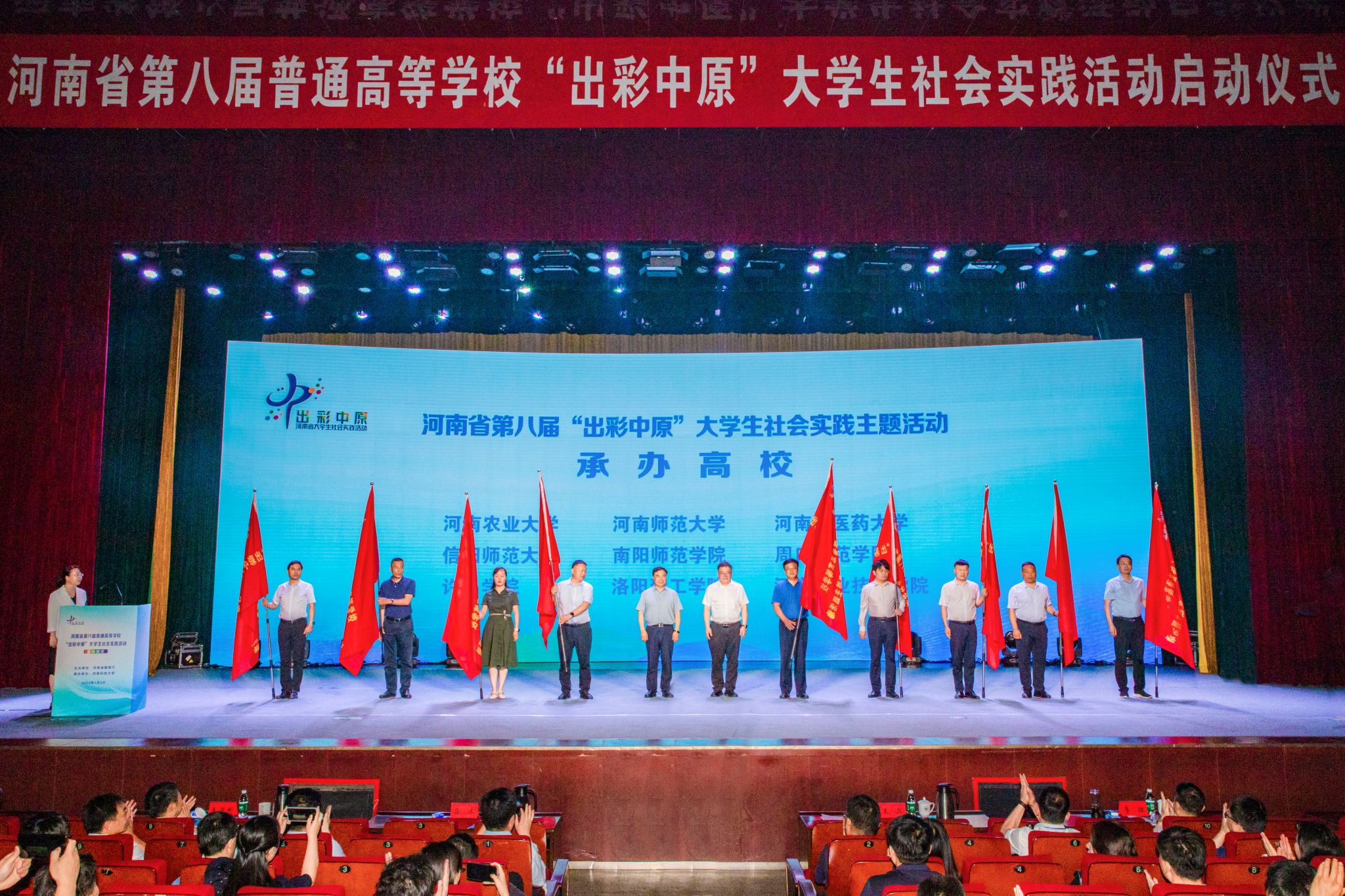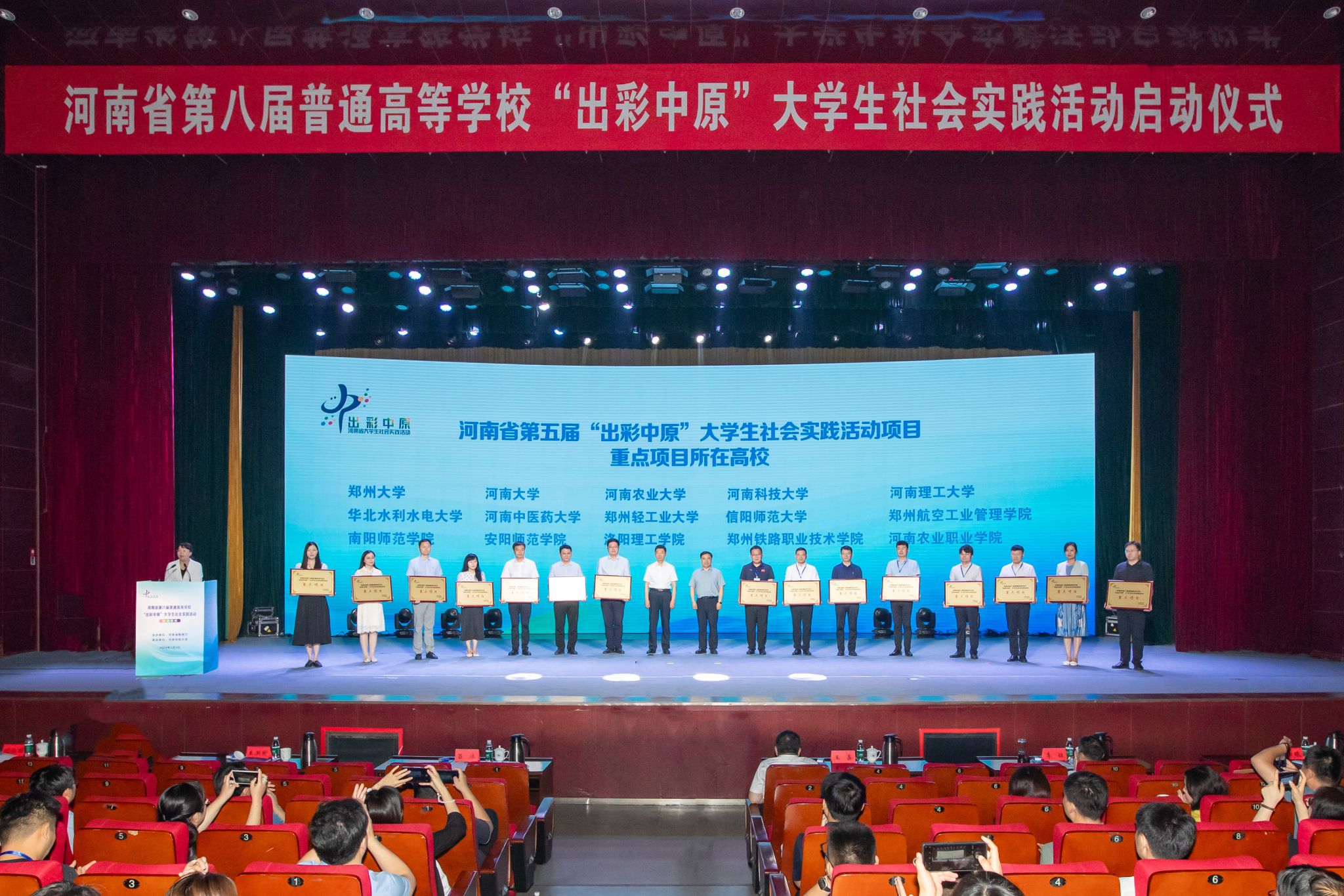 仪式上,与会领导为河南省第五届普通高等学校“出彩中原”大学生社会实践活动重点项目所在高校颁奖,向9所第八届“出彩中原”大学生社会实践主题活动承办高校授旗,启动了河南省第八届普通高等学校“出彩中原”大学生社会实践活动。