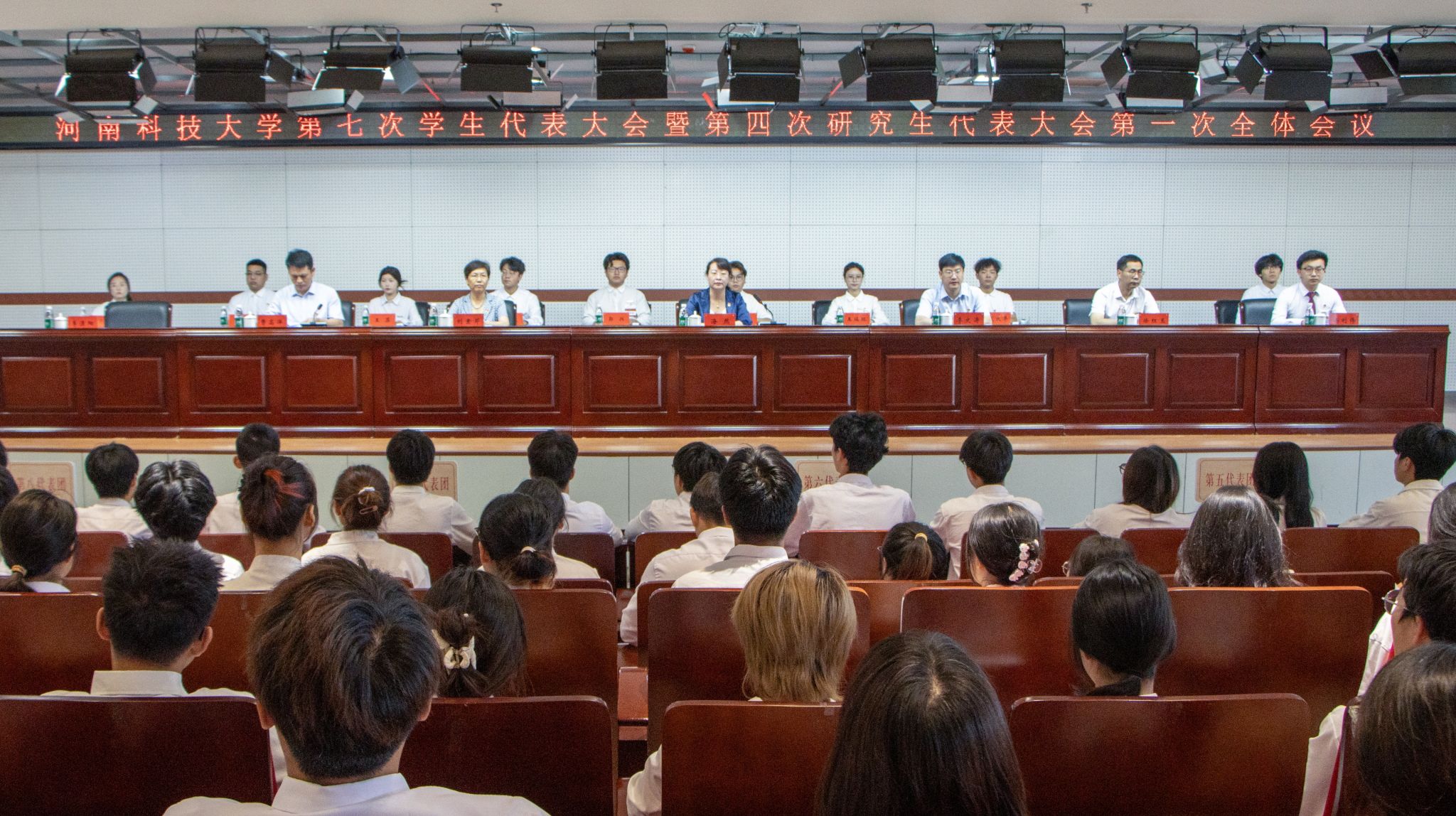 团委书记曹高洋向第七次学生代表大会暨第四次研究生代表大会致贺词。学生会执行主席邵明华、研究生会执行主席邵磊分别代表学生会、研究生会作工作报告。
